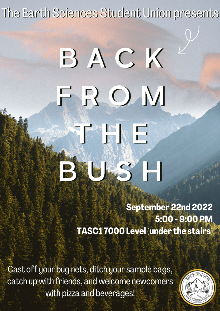 After a Summer of fieldwork, research or classes, the ESSU invites you to join our Back from the Bush party! The event starts at 5:00pm on September the 22nd. Head on down to TASC 1 on the 7000 level (underneath the stairs) for a night of pizza, beverages (alcoholic and sans alcohol), games, music and socializing! Connect with fellow students, grad students, and faculty. Please note that this event is only open to students who are Earth Science majors, minors, or currently taking an EASC course. Faculty and grad students in the Earth Science Department are also welcome.
