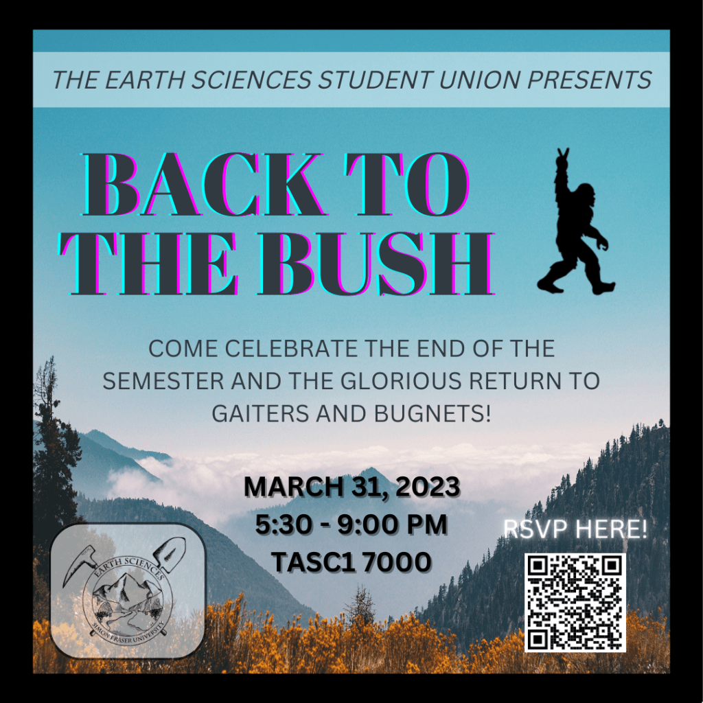 Back to the Bush is on! The ESSU will be hosting a back to bush event over zoom during the last week of the semester on Friday, April 16th. We will be opening up the event early at 5:00pm, with the main portion of the social occurring from 6:00 – 9:00pm. Back to the bush is RSVP, and the link is posted below. We will have options to host breakout rooms corresponding to the field schools this upcoming summer, so this is a good chance to possibly meet your fellow classmates and learn some important tips about field school from students who have taken it prior!